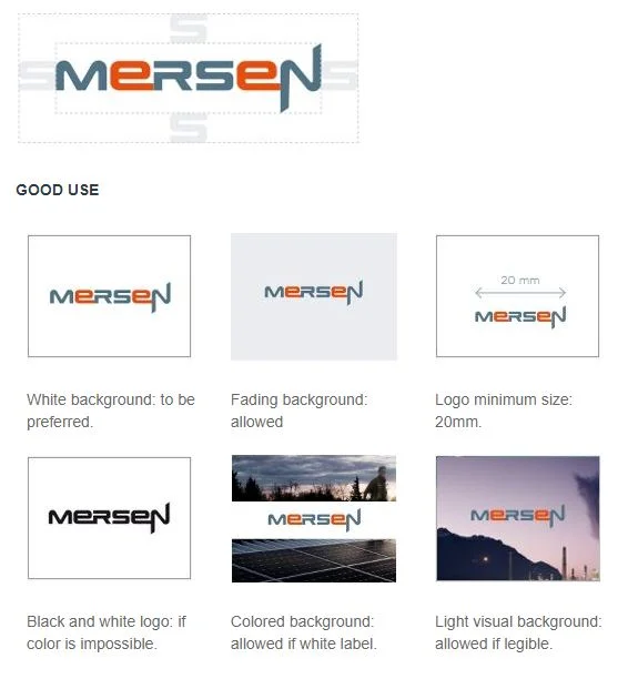 The logo must always be surrounded by a minimal space in white. The letter “S” of Mersen serves as a measuring unit to define the minimum exclusion zone.