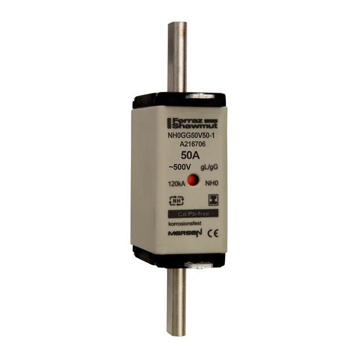 DIN NH Standard fuse-link gG Size NH0 500VAC 250VDC 50A isolated tags Double indicator Body width 30 mm