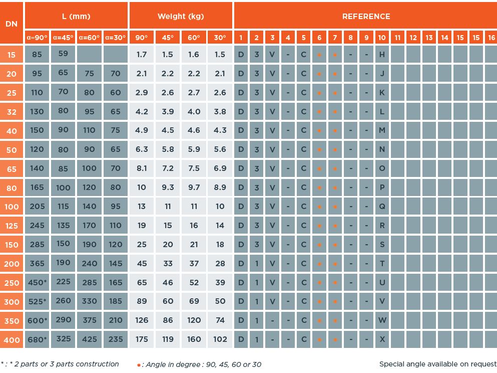 PTFE lined ined elbows are manufactured with angles of 90°, 60°, 45° or 30°.