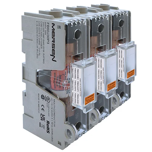 Les nouveaux porte-fusibles ouverts Mersen de Classe J Génération 2 peuvent être équipés de fusibles de Classe J de 0-100A, 600V. Un choix de connecteurs à vis, à plaques de pression et à boîtes convient à une large gamme de fils toronnés ou solides. Les supports fusibles Gen2, de forme arrondie plus compactes que les modèles traditionnels peuvent être montés sur rail DIN et assemblés pour un montage multipolaire sur site. Les supports fusibles sont conformes à la norme IP20 en utilisant les nouveaux couvercles de Mersen.