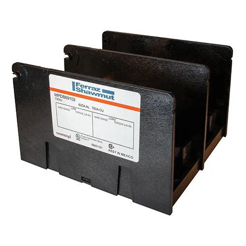 Les blocs de distribution de Mersen offrent une façon sûre d'épisser les câbles, de diviser la puissance au primaire en plusieurs circuits secondaires ou en points de jonction fixes. À moins d'indication contraire, tous les blocs sont approuvés UL et CSA et se conforment aux exigences UL508A et du National Electrical Code® pour l'espacement des circuits d'alimentation et de dérivation. Ces blocs offrent une connexion simple ou double au primaire et jusqu'à 30 raccordements secondaires. Des blocs spéciaux sont disponibles permettant jusqu' à 7 entrées principales. La série MPDB est offerte en trois catégories de formats: miniature (séries MPDB62 et MPDB63), intermédiaire (séries MPDB66 et MPDB67) et large (séries MPDB68 et MPDB69), en aluminium et en cuivre.